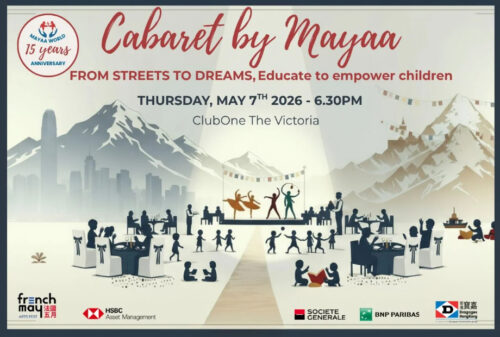 Cabaret by Mayaa revient le 7 mai à ClubOne, The Victoria, événement associé au French May Arts Festival. Cette édition anniversaire célèbre 15 ans de Mayaa au Népal et 10 ans à Hong Kong. Au programme : un dîner-spectacle d’une heure mêlant chants, danse et magie, suivi d’une tombola, d’une vente aux enchères silencieuse et d’une vente aux enchères en direct. Les fonds soutiendront notamment la création d’un « coin bien‑être » à l’Aberdeen Technical School.