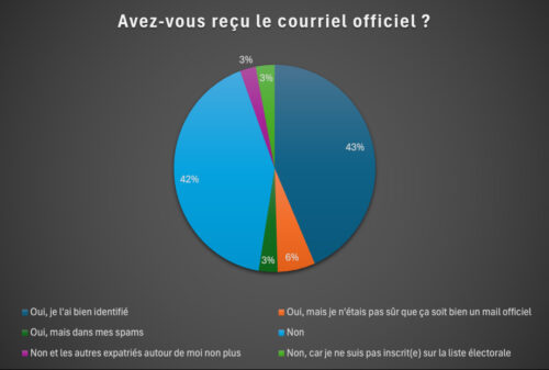Premier enseignement, la communication aux électeurs montre que 45,48% des répondants affirment qu’ils n’ont pas reçu le mail pour voter en ligne. Il faut donc vérifier vos spams. Malgré tout, la majorité sont « plutôt confiants » dans le vote en ligne. Les expatriés se demandent quel est le niveau de sécurité autour de ce système. Un effort de l’administration consulaire et des candidats est donc à à fournir sur le vote en ligne. Car la clé de la participation se fera sur la confiance accordée dans la sécurité du scrutin. Pourtant, les chiffres montrent que 71% des répondants privilégient le vote en ligne, contre 17% pour le vote à l’urne et 1% pour la procuration. Il est notamment perçu comme plus pratique.